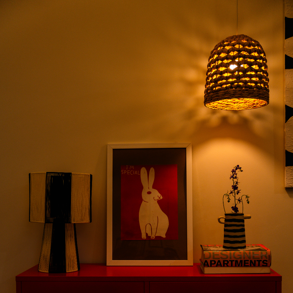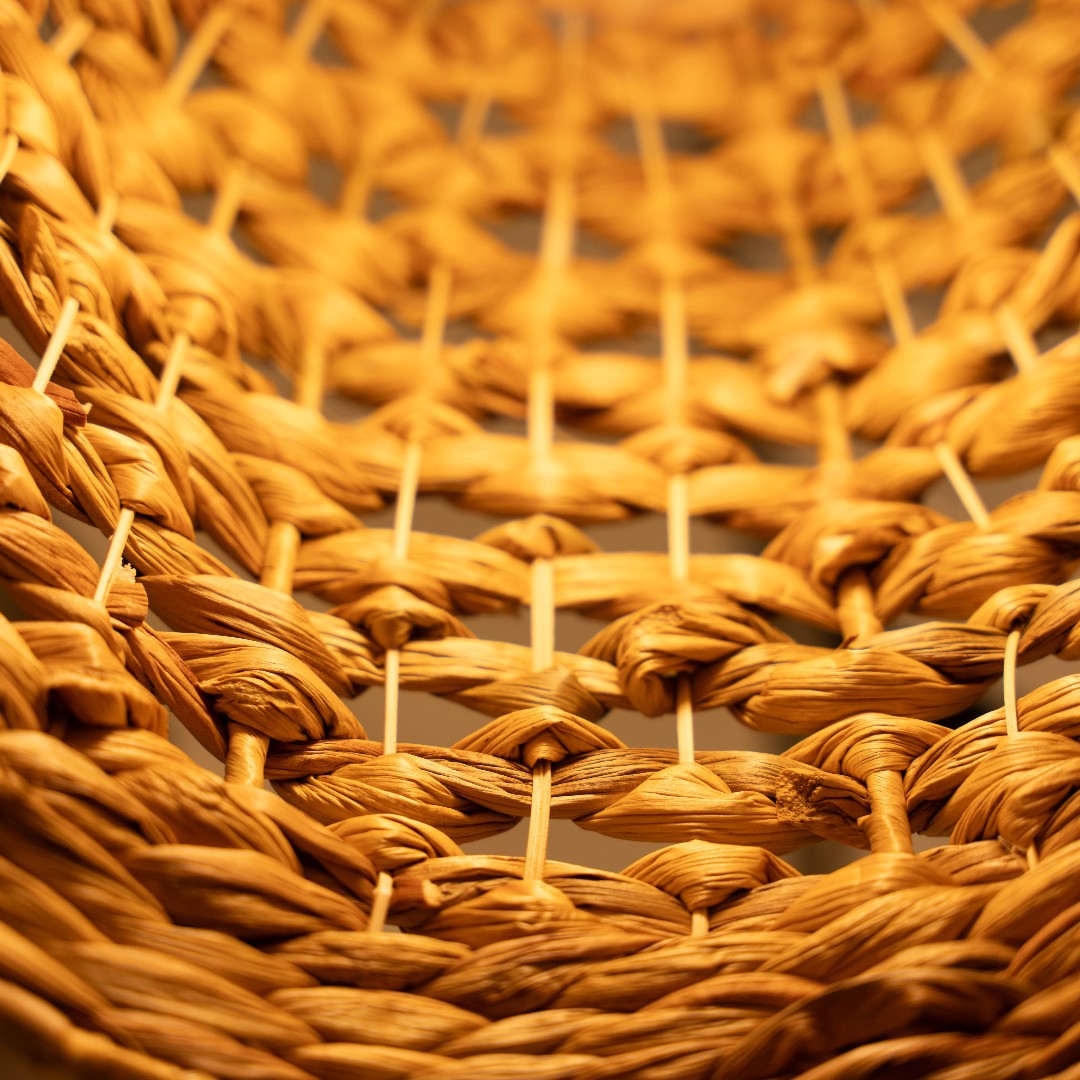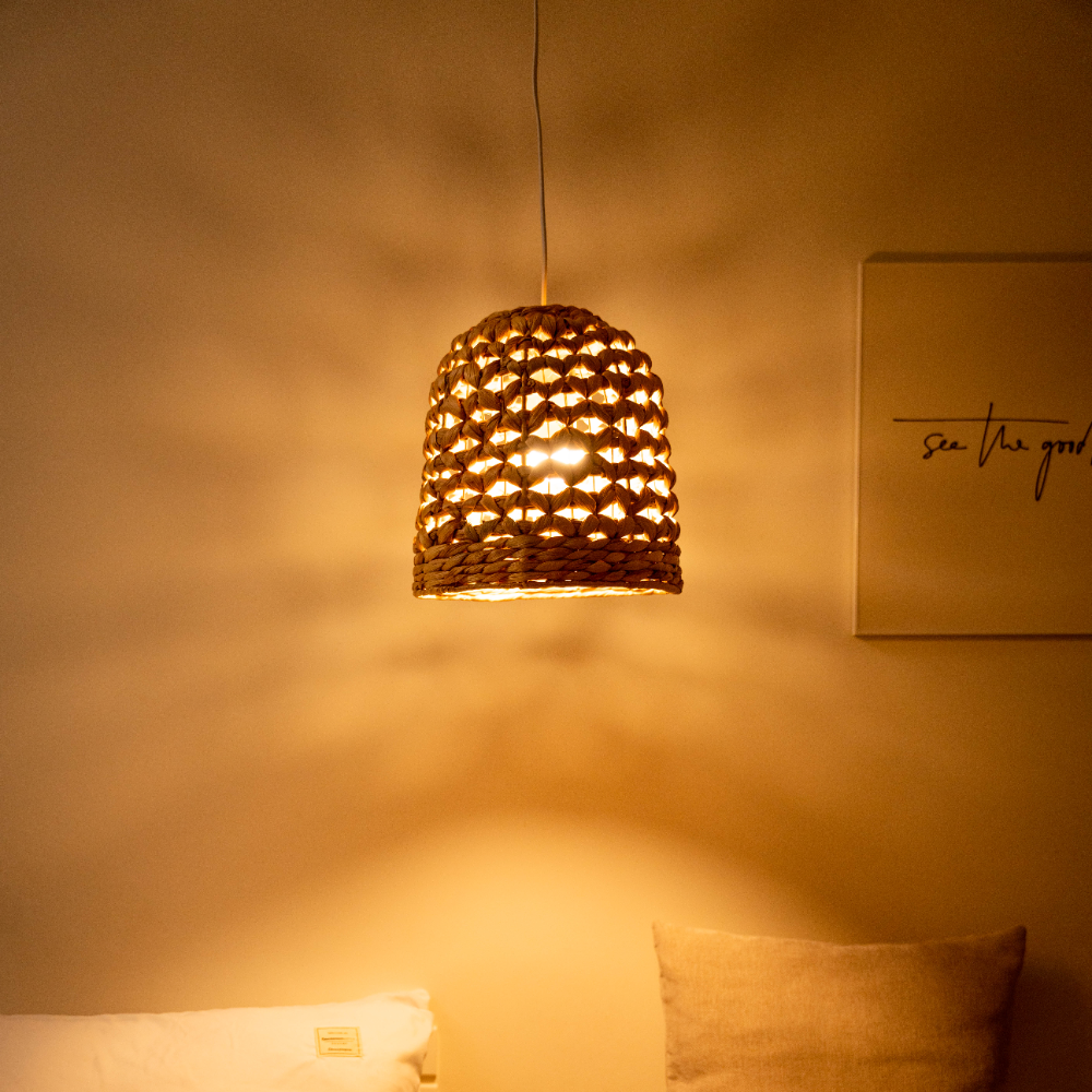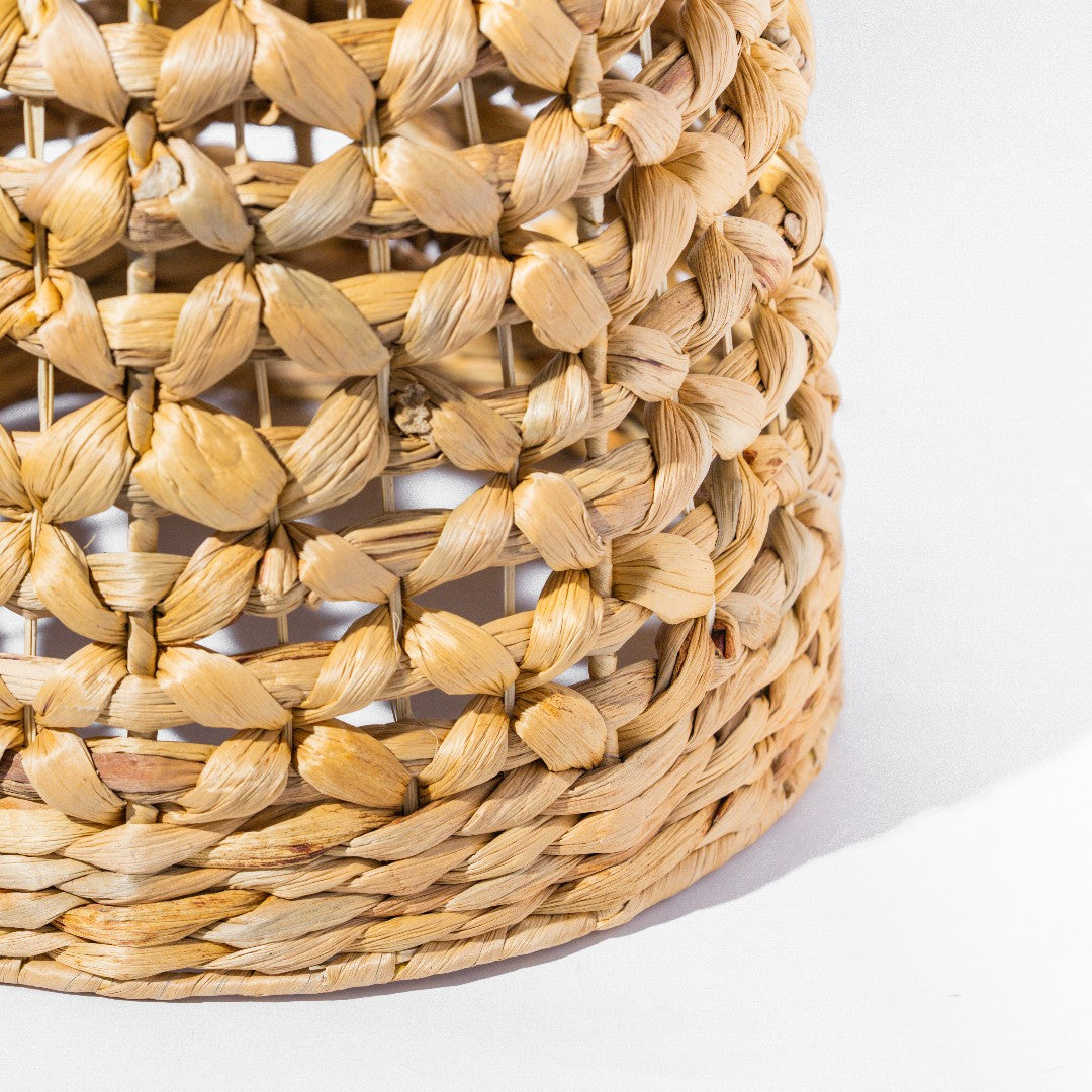 The Bloom is crafted from water hyacinth and steel. Water hyacinth is a soft, sustainable natural fibre, ideal for weaving intricate patterns and gently diffusing light. The open weave creates a warm, natural glow, casting beautiful patterns of shadow and light that make The Bloom as much a piece of art as a functional pendant.