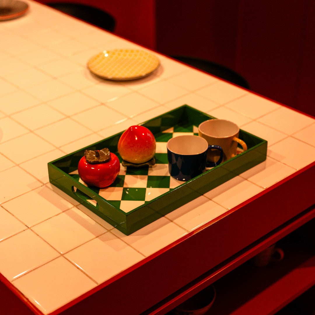 Finished in rich green lacquer, this chunky tray has a striking diamond pattern and a high gloss surface. A stylish statement piece, the Juicy Green brings a hit of art and colour to your home.