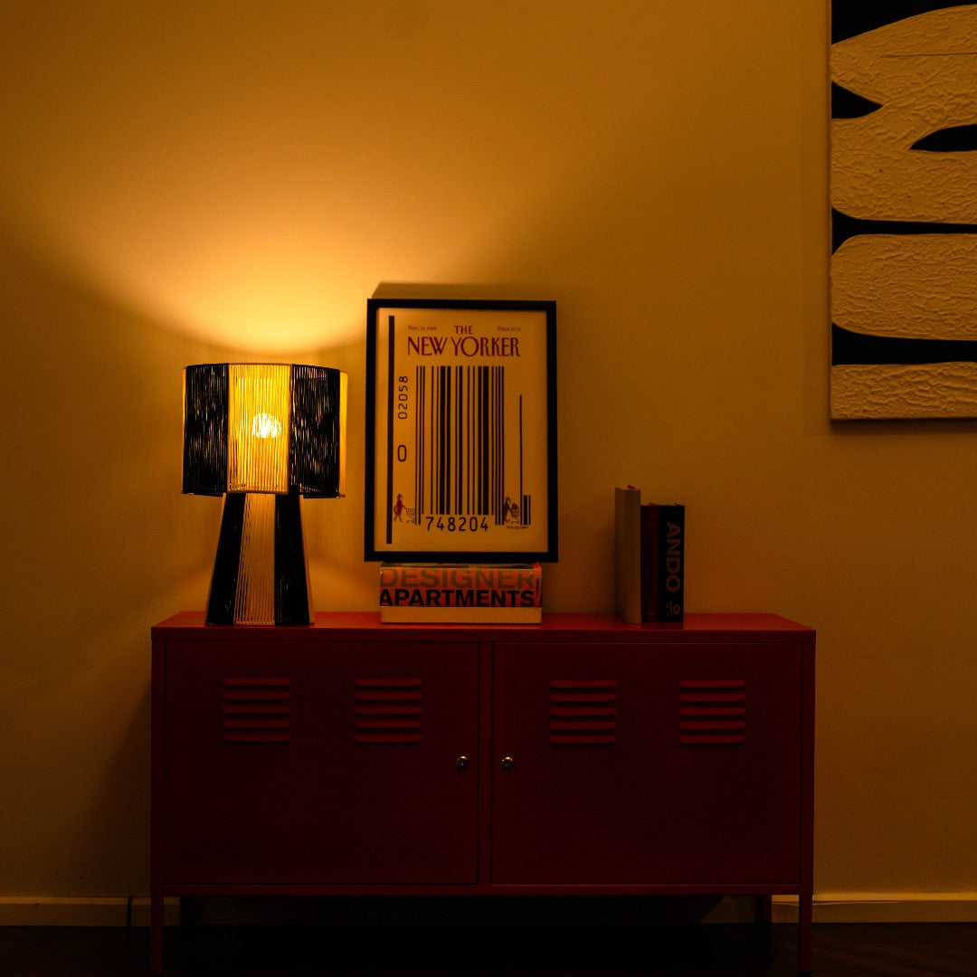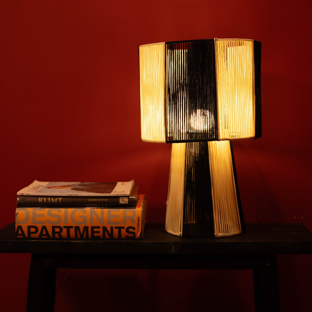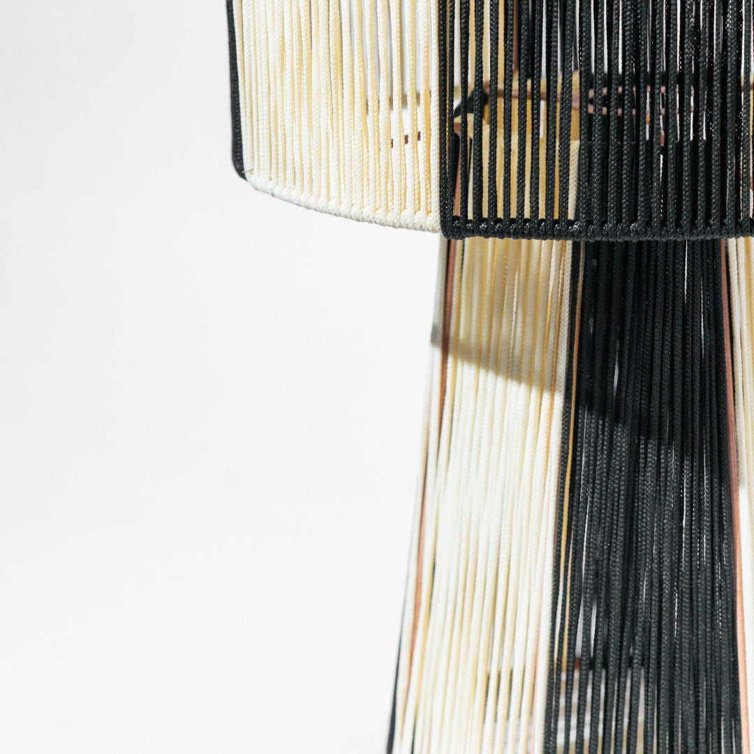 Mono No. 1 is a standing lamp crafted from string and steel. Elegant, chunky, and bold, its soft black and white strings emit a warm glow, while the balanced palette brings a sense of symmetry to a space. Both a functional lamp and a sculptural statement piece.