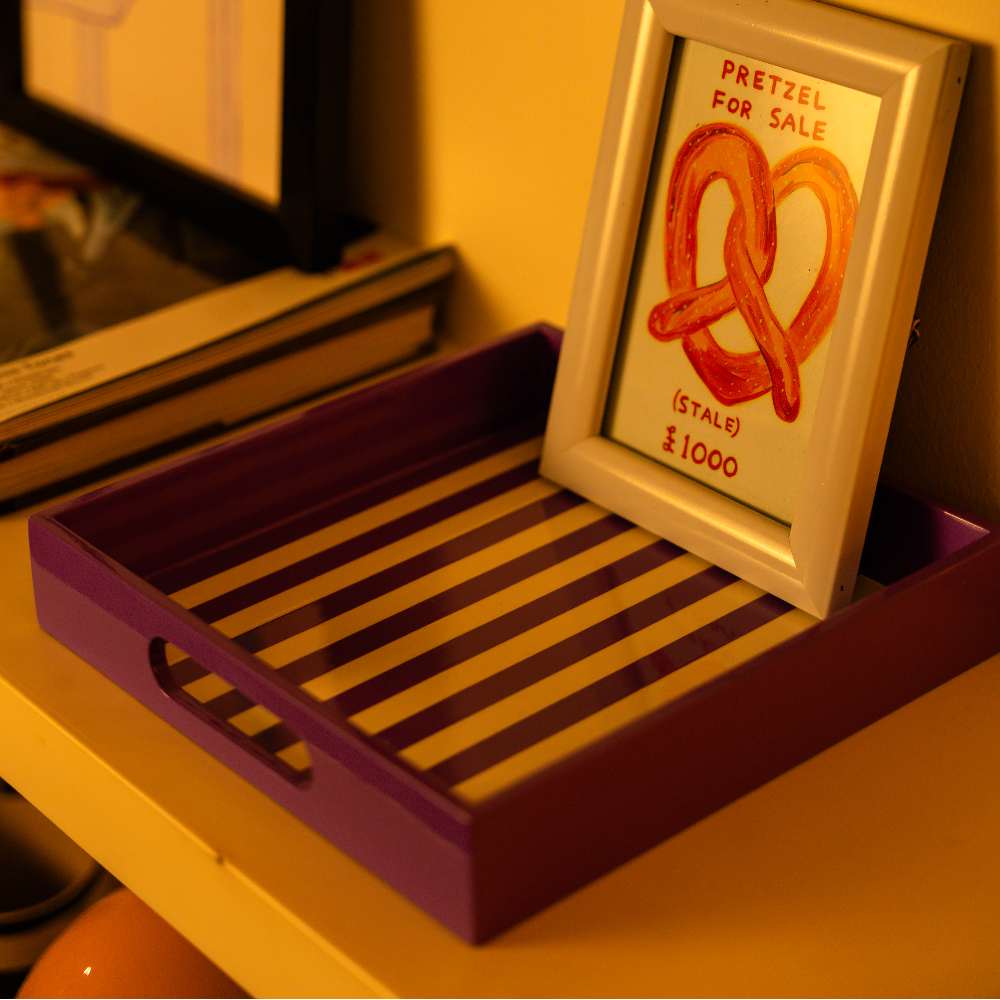 Finished in rich purple lacquer, this compact tray is defined by its fine stripe pattern and high-gloss surface. A playful accent piece with a sharp, modern edge.